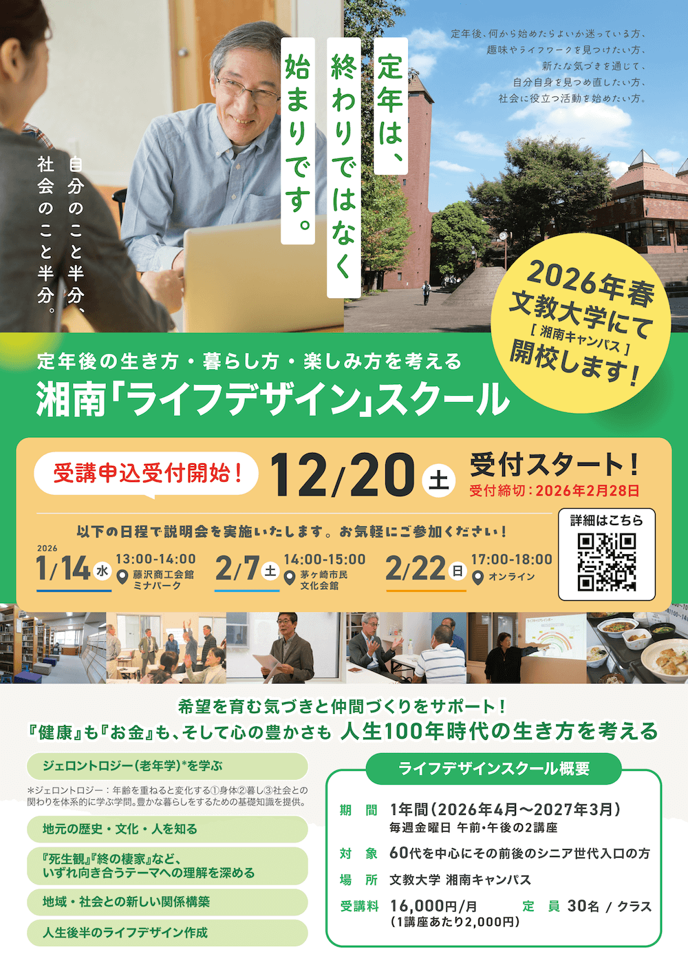 湘南ライフデザインスクールでは、定年後の生き方・暮らし方・社会との関わりをテーマに、同じような想いを持つ仲間とともに学び、出会いを通して視野を広げる場をご用意しています。